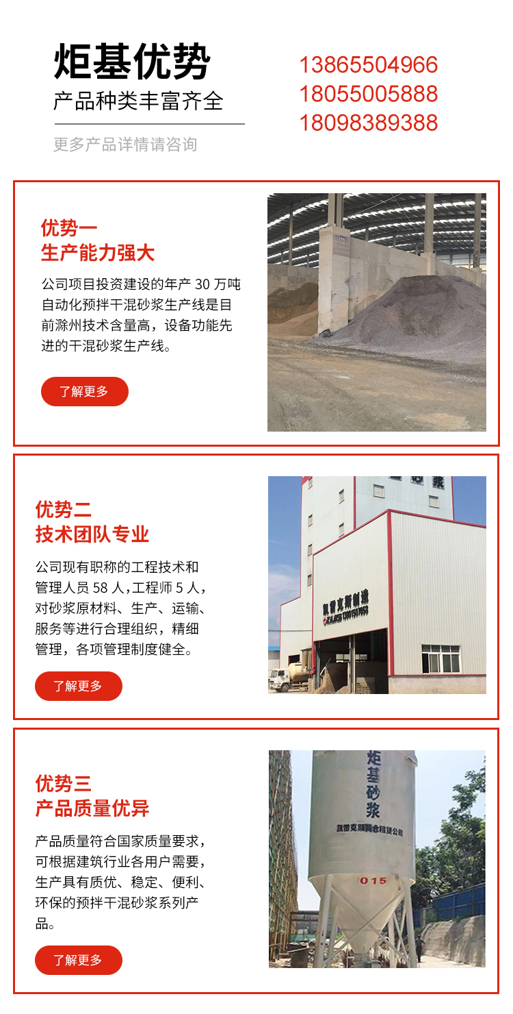 滁州市炬基节能新型建材有限公司,位于滁州市琅琊区西涧中小企业园新集路9号,占地60亩,注册资金3500万元。主要产品有C10-C100.P6-P20防水性能、耐酸蚀性能、耐久性及其他多功能混凝土;砌筑、抹灰、地面、防水等系列预拌干混砂浆、湿拌砂浆。公司拥有HZS180混凝土生产线三条,生产能力8000m2/天,年混凝土生产能力200万立方米;年预拌湿拌砂浆生产能力50万立方米;年产80万吨机制砂生产线两条。公司拥有每小时烘砂70吨,年产30万吨自动化预拌干混砂浆生产线,是目前滁州地区技术含量高,设备功能先进的干混砂浆生产线。